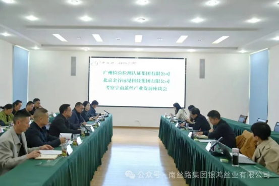 11月11日,广州检验检测认证集团有限公司(以下简称“广检集团”)与北京金谷远见科技集团有限公司(以下简称“北京金谷远见”)考察团到宁南县,深入调研当地蚕桑全产业链发展情况,并就深化战略合作、推动产业升级展开交流座谈会。南丝路集团、金桑庄园、银鸿、谊兴丝业领导及相关部门负责人共计18余人参加会议。