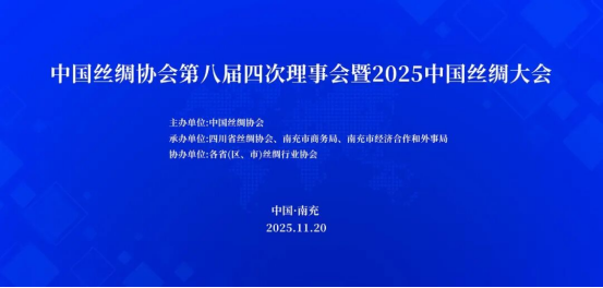 2025年11月20日,中国丝绸协会第八届四次理事会暨2025中国丝绸大会在四川省南充市国际会展中心顺利召开。本次会议由中国丝绸协会主办,四川省丝绸协会和南充市商务局承办,各省(区、市)丝绸行业协会协办。2025 年是“十四五”规划收官之年,也是谋篇布局“十五五”发展的关键之年,本次会议以“谋新篇、开新局、启新程”为主题,贯彻落实党的二十届四中全会精神,交流重点省市茧丝绸产业发展经验,总结本年度协会工作,共同探讨行业改革创新举措,推动我国茧丝绸行业高质量发展。来自国家相关部门、行业协会、科研院所等领导嘉宾,茧丝绸企业参会代表及相关媒体等共三百五十余人参加大会。