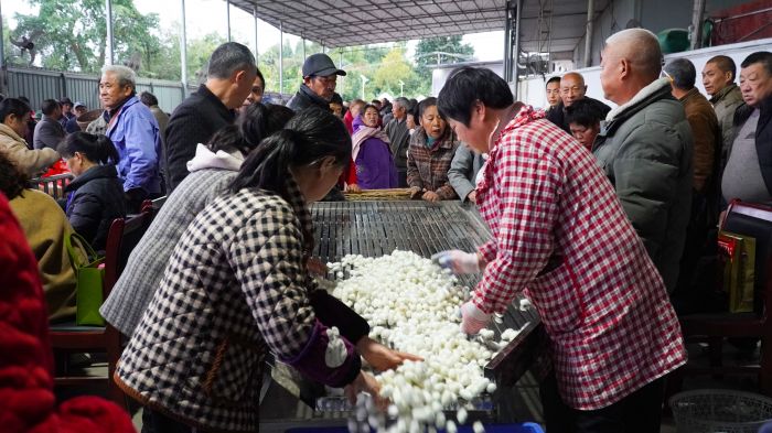 近日,威远县龙会镇高湾村迎来今年最后一批桑蚕茧收购。收购点前,前来交售蚕茧的蚕农络绎不绝,收购商根据质量进行定价、过秤、结算。