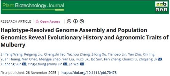 近日,浙江省农科院蚕桑与茶叶研究所桑育种与栽培团队联合北京大学、浙江农林大学、台湾大学等多家科研单位,在《Plant Biotechnology Journal》(IF=12.4)上发表了题为“Haplotype-Resolved Genome Assembly and Population Genomics reveal Evolutionary History and Agronomic Traits of Mulberry”的研究论文。该研究成功完成了我国两大主栽桑树品种‘农桑14号’与‘强桑1号’的高质量单倍型基因组组装,首次以确凿的分子证据揭示了桑树的起源与传播历史,揭示了控制桑树产量、抗病性等关键农艺性状的遗传密码,为桑树分子育种奠定了里程碑式的基础。