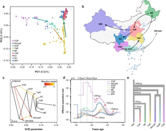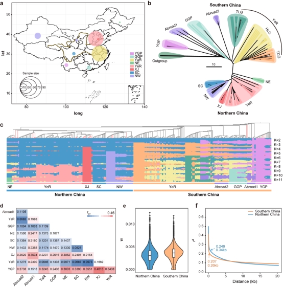 桑树的起源在学界长期存在争议。为破解这一谜题,本研究对来自全球12个国家的376份桑树种质资源进行了系统分析,其中包括39株具有数百乃至上千年树龄的珍贵古桑树。研究结果系统解析了桑树起源、扩散轨迹及南北群体遗传分化规律,通过分子证据明确了云贵高原为桑树起源中心。研究进一步揭示,桑树从起源地出发,主要沿着"由南向北"的路线在中国境内扩散,这一迁徙过程导致了显著的南北种群遗传分化。值得关注的是,南方种群表现出更高的遗传多样性,这一发现为云贵高原作为桑树起源中心提供了有力佐证(图2、图3)。