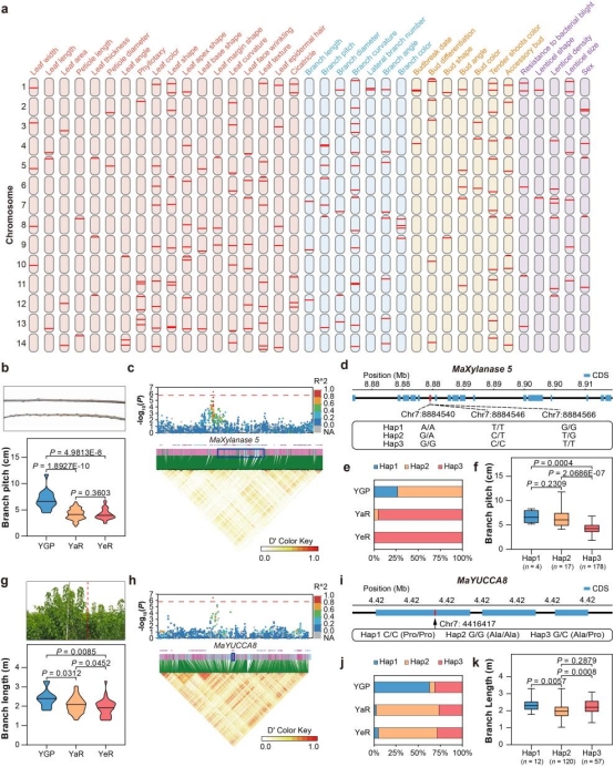 目前,桑树性状的遗传解析多局限于少数类型,缺乏大规模系统性研究,严重制约了桑树分子育种的进程。为突破这一瓶颈,研究团队系统调查了37个与桑树生长发育及抗性相关的重要农艺性状,通过GWAS分析鉴定到了204个关键位点,并对茎节长度、株高、发芽时间、叶片大小、叶片厚度等关键生产性状进行单倍型解析,精准鉴定调控性状的相关基因,为桑树分子设计育种奠定坚实基础。