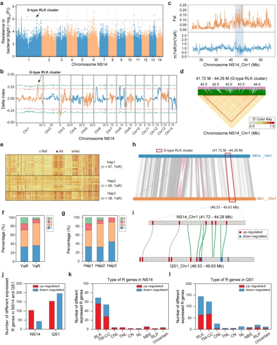 桑疫病是近年来危害桑产业的主要细菌性病害,对产业造成了极大经济损失。为解析桑树的桑疫病抗性机制,团队历时五年构建了强抗病品种‘农桑14号’与易感病品种‘强桑1号’的子代分离群体,对子代538个群体进行连续3年的抗病性调查,通过BSA+GWAS策略,首次发现位于1号染色体的G-type RLK串联超级基因簇在桑树疫病抗性中的关键作用,揭示了桑树抗病性的核心遗传基础,为桑树抗病分子育种提供了关键靶点与理论依据(图5)。
