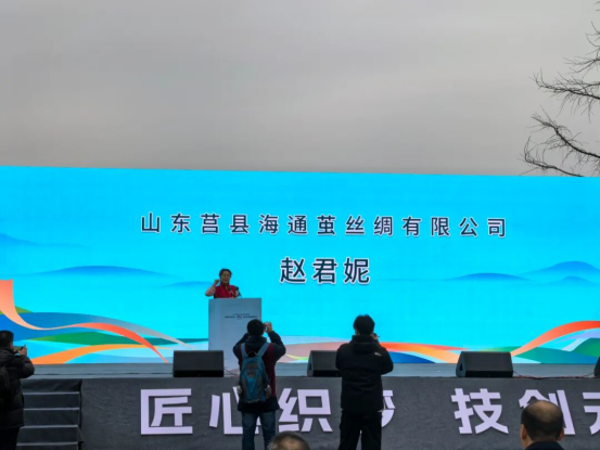 山东莒县海通茧丝绸有限公司赵君妮代表参赛选手宣誓,将严格遵守比赛纪律规则,服从裁判安排,秉持行业优良作风,在赛场上展现过硬本领,绽放选手风采。