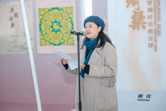 开幕式上,中国丝绸博物馆馆长季晓芬向大家介绍特展的策展思路与“把吉祥中国带回家”公众体验活动的核心计划。并表示丝绸是中华优秀传统文化的璀璨瑰宝,吉祥纹样则承载着古人对美好生活的向往与追求。此次与杭州萧山国际机场携手,不仅是将博物馆的专业展览“搬出馆舍”,更是通过“把吉祥中国带回家”系列社教活动,让非遗技艺、吉祥文化走进大众日常生活,让每一位旅客都能成为丝绸文化的体验者、传承者与传播者。
