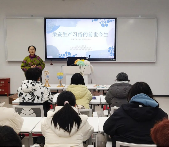 12月25日,嘉兴大学设计学院的课堂里迎来了一位特殊的授课老师——秀洲区天福蚕桑生产习俗代表性传承人、嘉兴大学“非遗特聘专家”周利萍。她以《蚕桑生产习俗前世今生》为题,为青年学生带来了一场兼具文化深度与实践启发的非遗专业课。