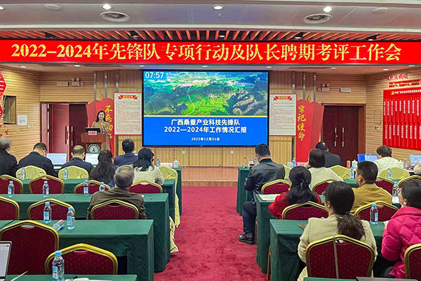 2025年12月31日上午,2022—2024年广西科技先锋队专项行动及队长聘期考评工作会在广西农业科学院召开。广西农业科学院、广西科学院、广西大学等10家单位的70余名先锋队专家代表参加会议。广西蚕业技术推广站黄红燕副站长作为广西桑蚕产业科技先锋队副队长参加了会议。