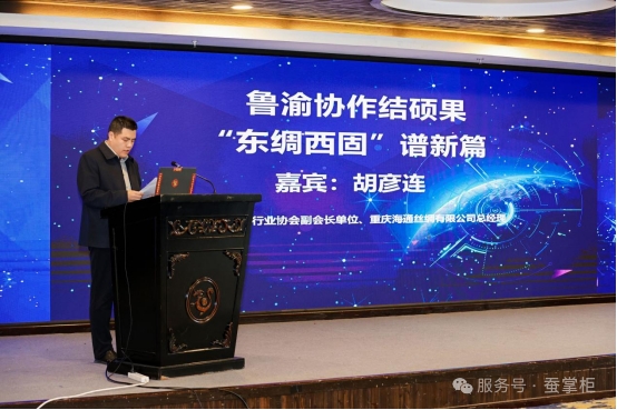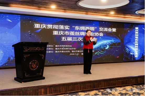 重庆市商务委市场体系建设处三级调研员袁徐宏围绕“凝聚合力 务实服务 共抓‘东绸西固’历史机遇”主题发表专题演讲。袁徐宏调研员指出,国家七部委联合印发《关于开展茧丝绸产业“东绸西固”工作的通知》明确构建“东部创新引领、中西部产能支撑”新格局,标志产业进入“深加工协同、全价值链重塑”新阶段。目前,重庆正结合《通知》要求编制蚕桑丝绸产业“十五五”规划,绘制五年发展路线图。2026年,将聚焦关键环节精准发力,围绕“巩固前端、突破中端、强化协同”目标,重点推进三大行动:一是巩固前端优势,在“种业振兴与高效种养”上筑牢发展根基。二是突破中端瓶颈,在“技术转化与链条补齐”上开拓产业空间。三是强化协同服务,在“优化生态与精准对接”上凝聚行业合力。