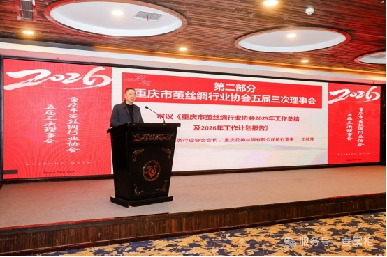 重庆市茧丝绸行业协会会长王岐炜作《2025年工作总结及2026年工作计划报告》,全面总结2025年协会在经费有限、人员不足的情况下,以“小机构、大服务”的工作模式,在技术培训、行业调研、品牌建设等多方面实现突破,有效发挥了桥梁纽带作用。2026年,协会将围绕“东绸西固”战略和重庆市蚕桑丝绸产业高质量发展“十五五”规划,紧扣“技术提升、品牌升级、市场开拓”总体目标,深入推进六大工作任务,全力服务会员单位,推动重庆市蚕桑茧丝绸产业高质量发展。