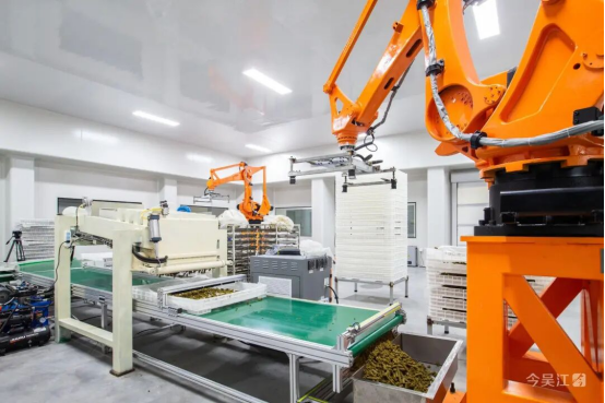 推开一扇气密门,映入眼帘的是一字排开的12间标准化智慧蚕房。在中科茧源的数智化车间里,没有成片的桑田,只有一排排标准化蚕架整齐排列。在物联网系统的精准调控下,温湿度、光照、通风等环境参数实时显示在中央控制室的大屏上;机械臂与AGV转运小车安静而有序地协作,进行饲料投喂与物料流转;“蚕宝宝”们享用的不再是新鲜桑叶,而是经过科学配比、高温蒸煮加工而成的营养颗粒饲料。