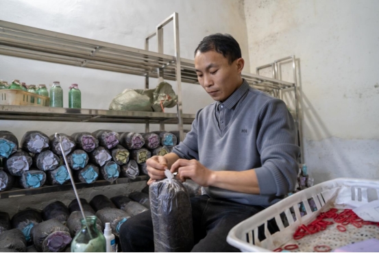 今年,基地计划培育菌包40万袋,预计年产值可达数百万元。这里不仅是生产车间,更清晰展现了“桑枝收购—粉碎加工—制包育菌”的完整产业链,吸引了不少本地村民在家门口就业。