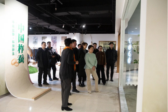 调研中,领导们沿着中国柞蚕展馆动线,认真观看柞蚕历史、文化、缫丝、织造、科技创新与综合利用等展品、传统技艺呈现及文化传播相关情况,通过实物展示与图文资料,直观感受五千年柞蚕文化的深厚底蕴,柞蚕产业承载着历史经典技艺的传承与使命。