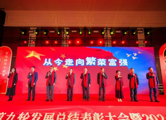 全场起立,共同唱响《歌唱祖国》。激昂的旋律回荡会场,凝聚起全体嘉欣丝绸人同心奋进的磅礴力量。