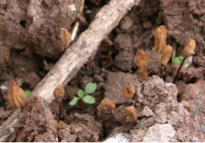 2.除草 果桑菌核病的菌核在桑园杂草生长湿润的地方易萌发生长子实体,3月上旬应对果桑园进行一次人工除草或喷施一次除草剂,既除杂草同时又能杀灭已萌发的菌核子囊盘。此外在3月上、中旬巡查果桑园,如发现果桑菌核萌发的子实体时(图1、图2),可立即喷洒除草剂,点杀桑菌核病的子实体及子囊盘,既节约大量药剂又精准点杀。