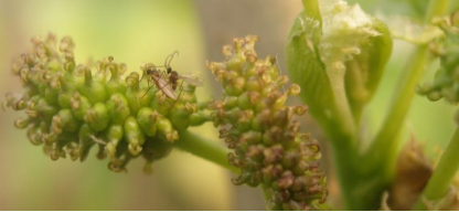 2.化学防治方法 果桑椹瘿蚊的越冬休眠体一般于3月中旬左右开始羽化,一周到10天后为羽化盛期。3月中、下旬巡查桑园(巡查方法是晴天或阴天上午11点左右,深入果桑园内,轻轻摇动果桑枝条,观察是否有椹瘿蚊成虫飞翔,(图5果桑椹瘿蚊雌雄成虫在桑雌花上交配),观察到果桑雌花上有椹瘿蚊的成虫或桑园中有椹瘿蚊的成虫飞翔时,使用10%吡虫啉可湿性粉剂2000倍液或80%灭蝇胺水分散粒剂1500倍液喷药防治,前述两种药剂任选一种使用。喷药时要从左到右、从右到左、从上到下、从下到上均匀周到喷洒到果桑雌花上。