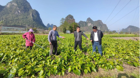 3月5日,在位于石别镇板围村那赖屯的2025年基层农技推广体系改革与建设项目农业科技示范展示基地里,农技人员正进入田间地头,查看桑苗生长情况,并指导农户如何精准开展桑园水肥管理、病虫害绿色防控、中耕除草等。