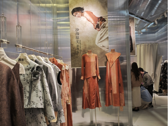 采访中,一品华裳的创始人张博介绍,服装行业传统的代理体系和门店体系正面临冲击,“旧时代的坛坛罐罐已经打碎了,新时代长什么样,我们也不知道”。他们的探索是:让产品成为其他品牌的“插件”,与大多数专注于服装品类的展商不同,“我们做的是‘锦上添花’的生意,也就是刺绣。我们与成熟的女装店合作,在同一个空间里补充国风配饰;与面料品牌联动,也为头部品牌提供伴手礼和秀场周边。”张博介绍。