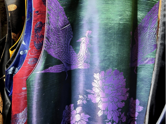王女士也介绍了一种很稀缺但很有特色的产品——用老缎面制成的衣服。“这些老缎面,都是七八十年代,甚至五六十年代农村结婚时留下的老被面,桑蚕丝的质地,保存完好,很多甚至从未使用过,我们回收回来,然后做成衣服。”王女士介绍,这些老缎都是用以前的小机器织的,手感柔和。放了五六十年,颜色会变得更加温润,不像新织出来那种缎面很亮、很扎眼。