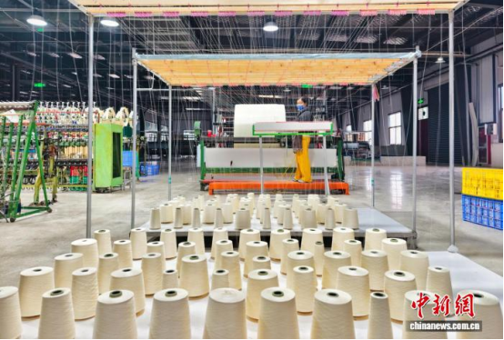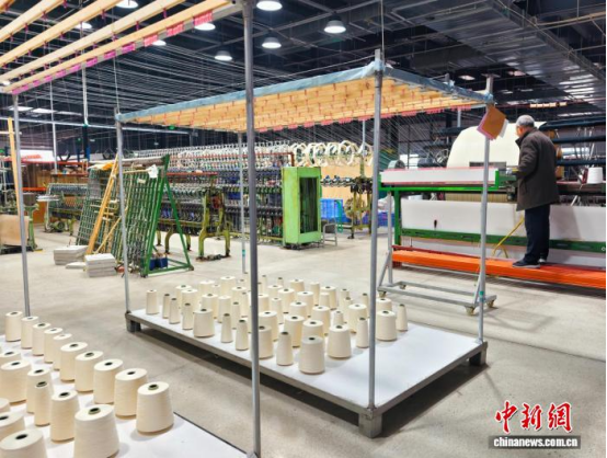 图为工人在现代机织上牵经