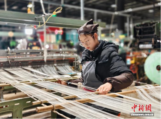 图为工人在络丝