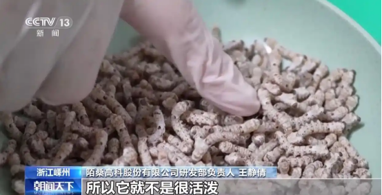 陌桑高科股份有限公司执行总裁 何锐敏:我们用人工饲料替代桑叶,做到365天天天可以养蚕。一颗蚕茧的茧丝长有1200米,外层跟内层粗细基本相同,所以质量是稳定的。