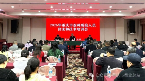 为筑牢蚕种质量安全防线,提升蚕种质检人员专业能力与法律素养,切实做好家蚕微粒子病防控工作,3月26日至27日,重庆市蚕业总站组织召开了2026年度家蚕微粒子病防控暨蚕种质检员普法和技术培训会。市商务委市场体系建设处一级调研员王庆、市蚕业总站站长李海波出席,各蚕种生产(冷藏)、经营单位相关负责人及质检人员,市蚕种质量监督检验站工作人员等60余人参训。会议特邀重庆市农业综合行政执法总队二支队队长朱凤群、西南大学教授潘敏慧分别开展普法和技术授课。