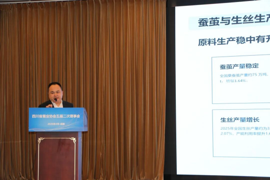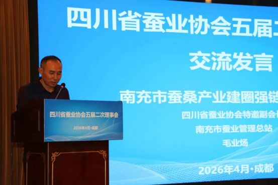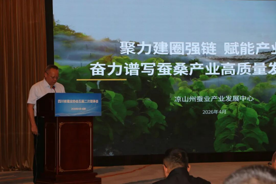 程明代表协会作五届二次理事会工作报告,并审议通过。报告指出,2025年全省蚕桑产业运行呈现“面积稳、价格稳、产量增、效益好”的良好态势,蚕茧产量达10.5万吨,同比增长20.69%;5A级以上高品质生丝占比超95%,产业质量持续提升。2026年是“十五五”规划开局之年,也是四川蚕桑产业纳入全省千亿级优势特色农业培育行列的关键之年。协会将重点聚焦种养提质、科技赋能、政策对接、文旅融合四大方向,推动产业从“大”向“强”转变。
