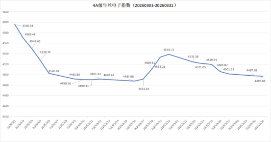 2026年3月,生丝电子指数在节后复工、地缘冲突扰动、内外需分化、新茧季临近等多重因素交织下,呈现先抑后扬再震荡、重心阶段性下移、多空博弈加剧的核心运行特征,全月指数围绕4500点关口反复博弈,累计下跌2.15%,最终在新茧季开启前维持弱势整理格局收于4500点下方。