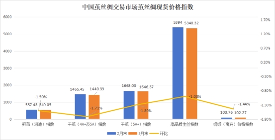 2026年3月,茧丝绸现货市场呈现全产业链价格同步下行、电子与现货联动承压、结构分化凸显、以价换量特征显著的运行格局。各品类指数环比上月全线收跌,产业链上下游呈现清晰的终端倒逼、反向传导的特征。