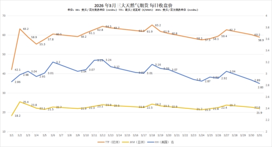 图6:2026年3月三大天然气期货每日收盘价(数据来源:洲际交易所(欧洲)、纽约商业交易所、普氏能源资讯)