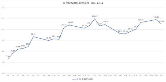 3月布伦特原油价格剧烈震荡、大幅冲高后回落,整月仍上涨44.15%,中东地缘冲突主导行情。