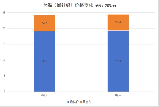 3月末丝绵(蛹衬绵)价格较2月末上行整体约2000元/吨左右,成为本月产业链中少数价格实现上行的品类。