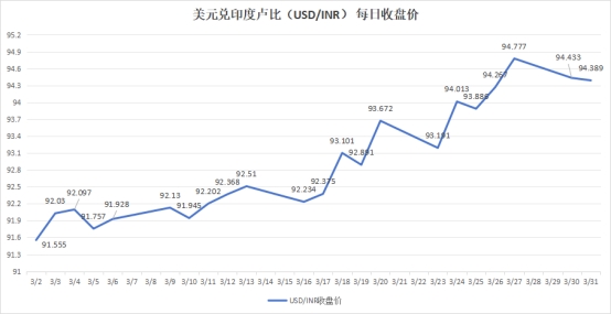 3月美元对印度卢比大幅升值,卢比呈现剧烈贬值走势,约3.50%。3月中旬以来,受中东冲突推高油价、能源进口成本攀升影响,卢比贬值加剧。3月30日,印度央行有经济救市行为。
