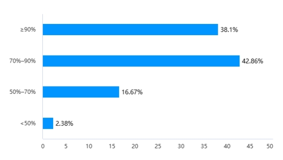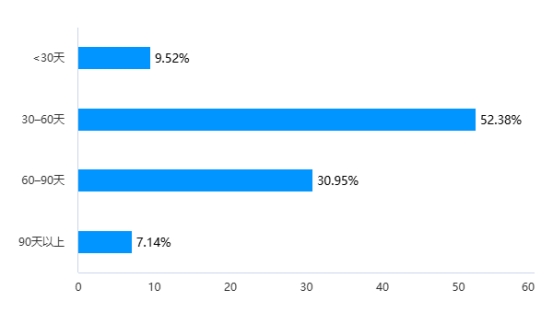 成本压力普遍存在,账期风险需警惕:超六成企业成本小幅抬升(≤5%)。多数企业账期集中在30-60天(52.38%),但60-90天账期占比达30.95%,资金周转压力有显现。