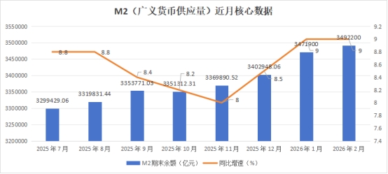 2026年1-2月M2同比增速均为9.0%,较2025年年末进一步提升,广义货币供应量充足,市场流动性宽松,为企业提供了良好的资金环境。