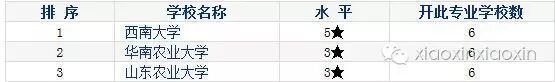 全国共有6所开设了蚕学专业的学校参与排名,其中排名第一的是西南大学,排名第二的是华南农业大学,排名第三的是山东农业大学。另外还有,沈阳农业大学、安徽农业大学、江苏科技大学。